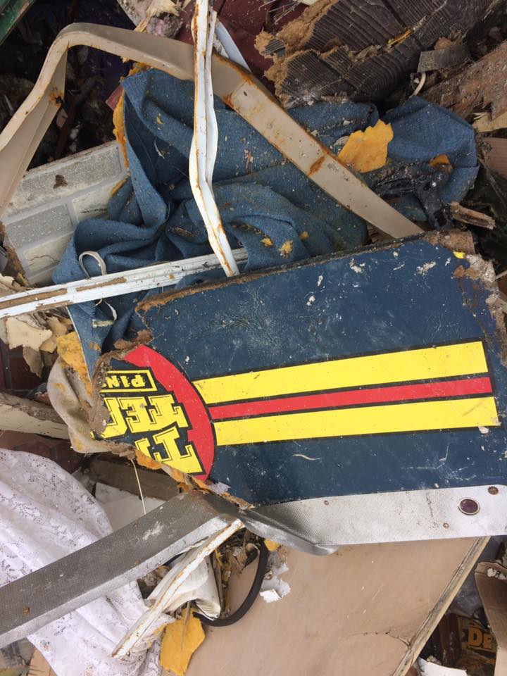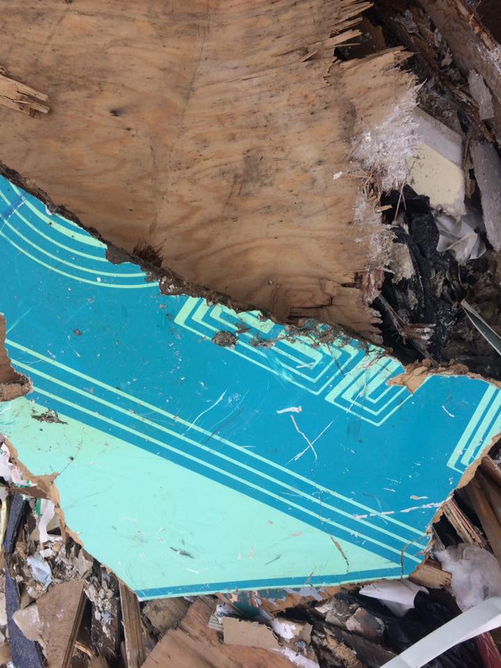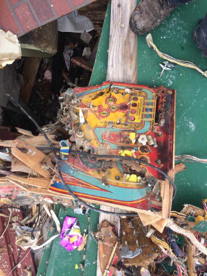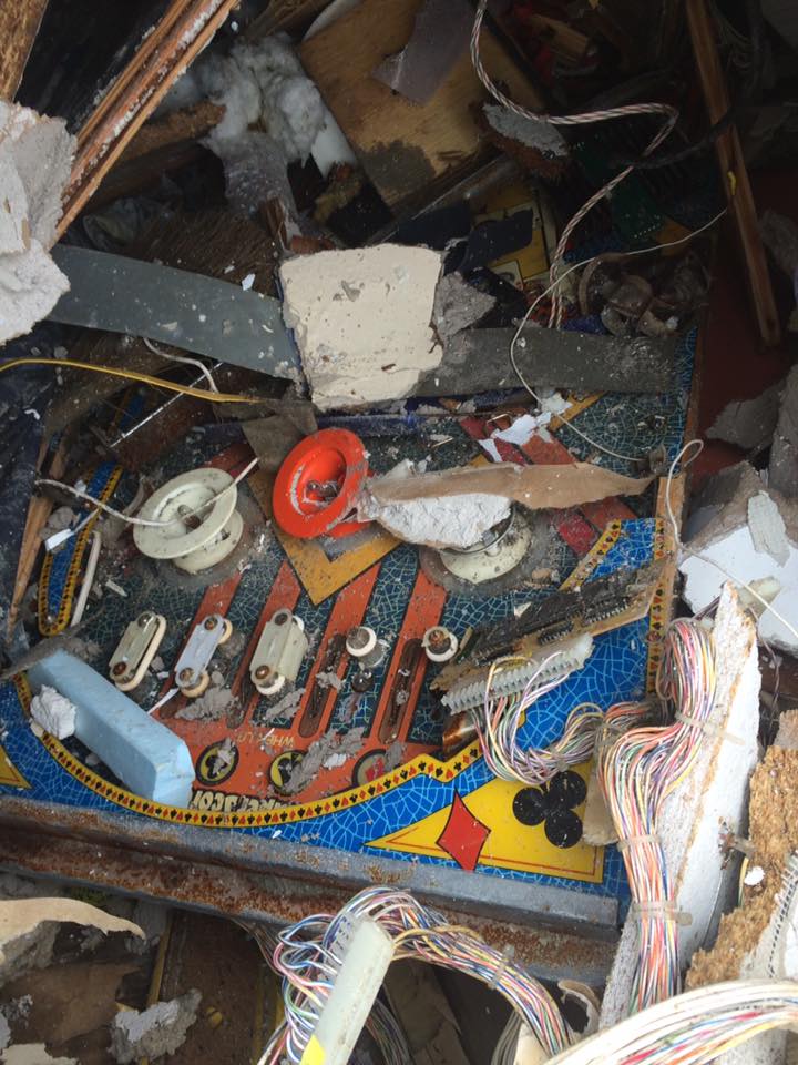Ralph picked through the rubble for about three hours before giving up. He identified a few things; a few coin doors, control panels and destroyed pinball play fields from a Baby Pac-Man, F-14 and a Jacks to Open and a few PCBs – all smashed up. He was left with this small consolation for his efforts: