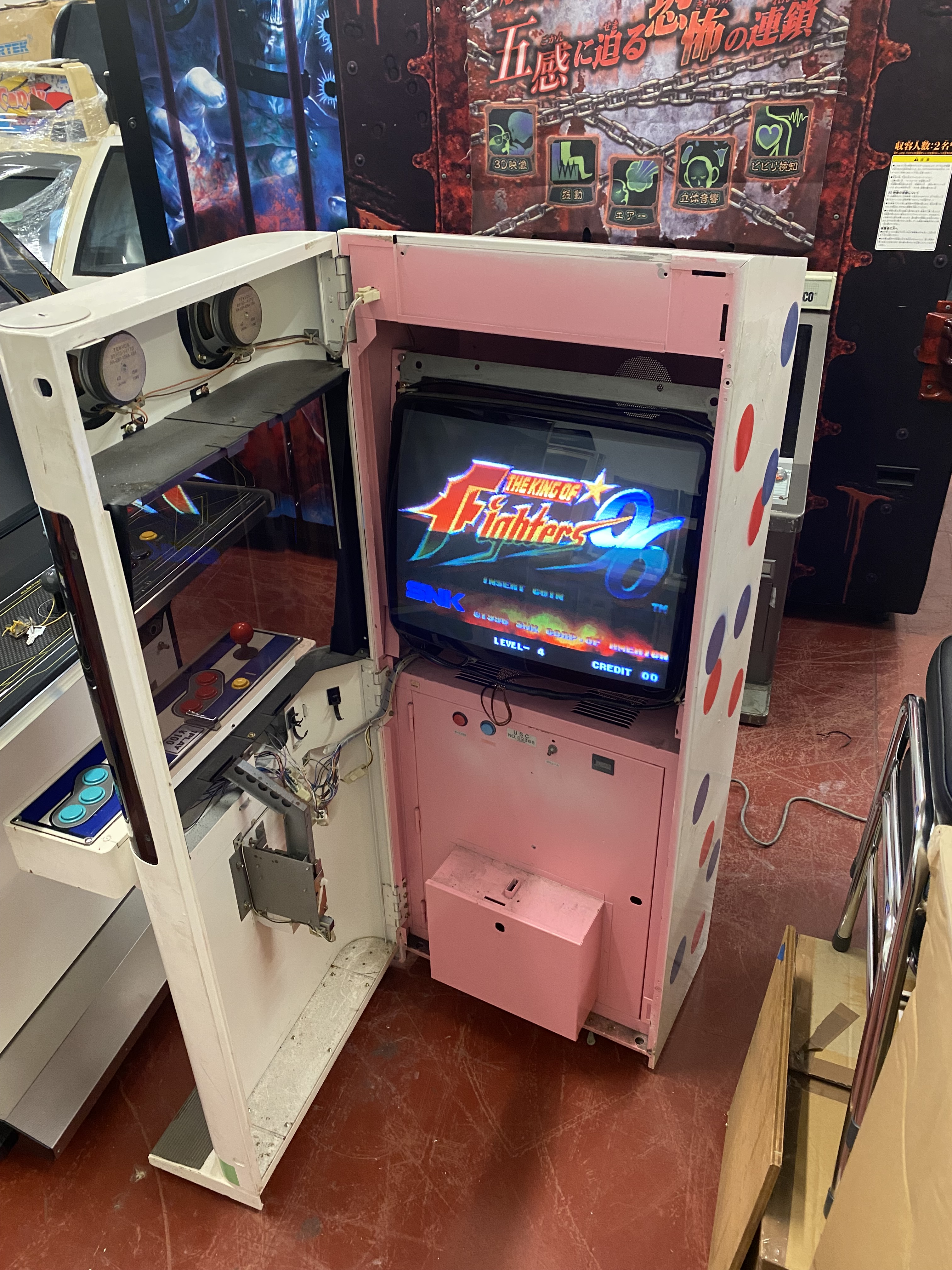 The good news is the cabinet was otherwise complete. All the original looms were there (it runs standard Jamma boards), and most, if not all of the difficult to replace hardware was intact, and everything works.