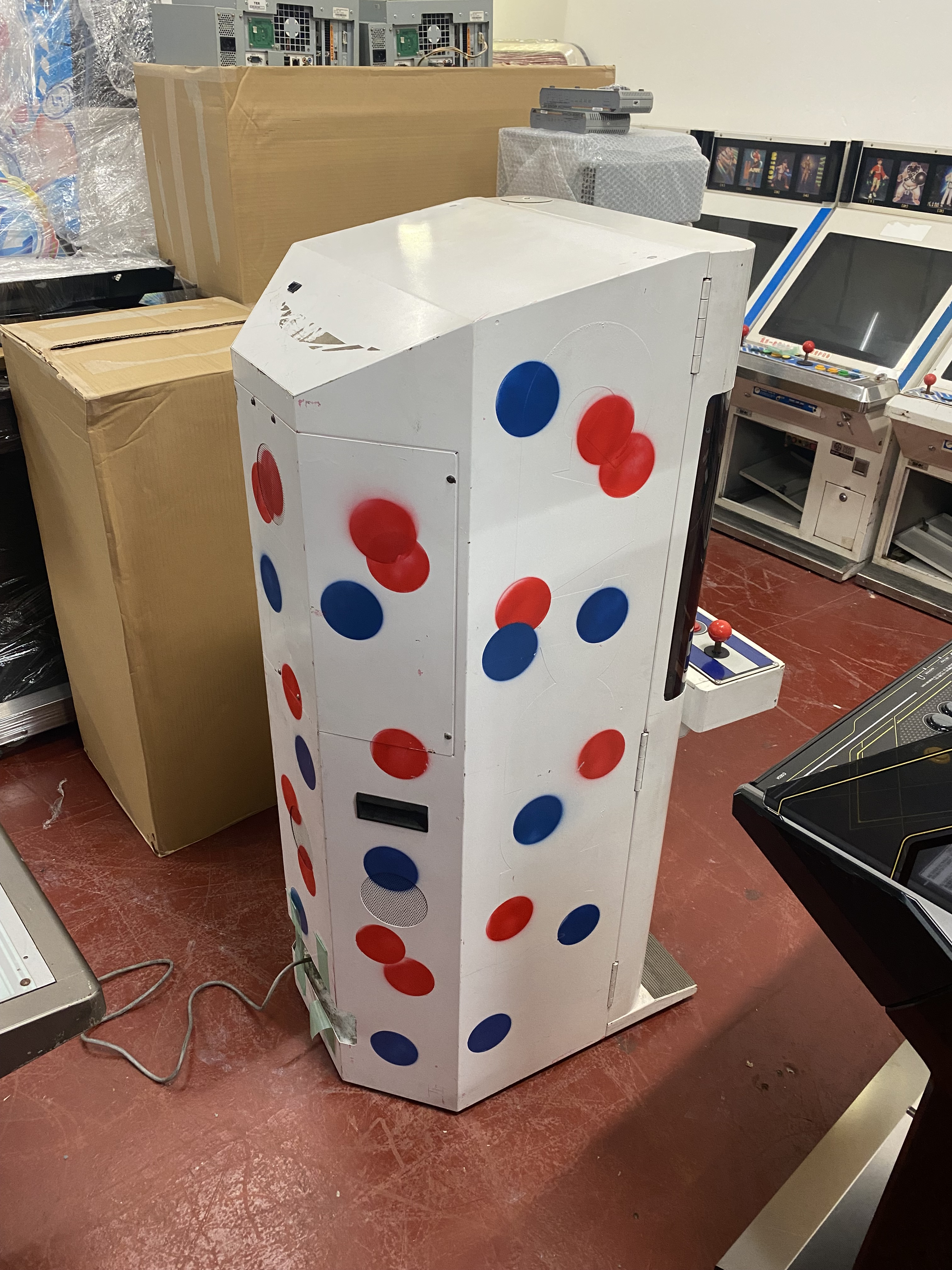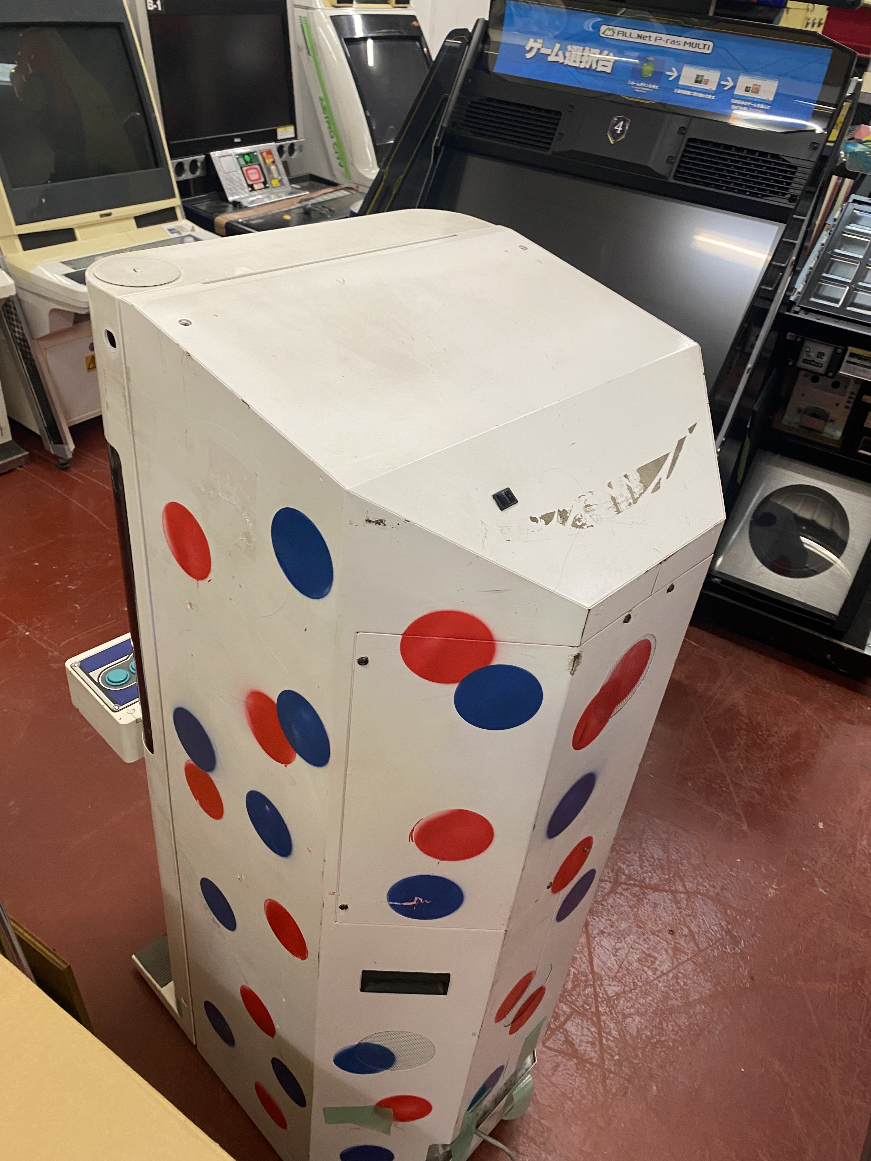 I know. It’s hard to imagine what the thought process was here. In short, someone (probably a Japanese operator), decided to go at the cabinet with a white spray can, and then added the red and blue dots all over the place. The spray job has been done crudely. You can even see the original “Capcom” logo sideart is still visible underneath. They didn’t even bother removing it first!